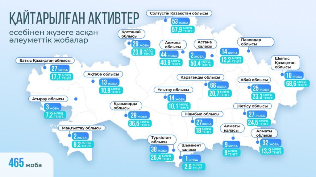 Бұл ретте жаңадан салынған әлеуметтік және инфрақұрылымдық нысандардың бір бөлігі қайтарылған активтер есебінен қаржыландырылып жатқанын атап өту аса маңызды. Өйткені бұл бюджетке салмақ салмай, өткір проблемаларды жедел шешуге мүмкіндік берді.